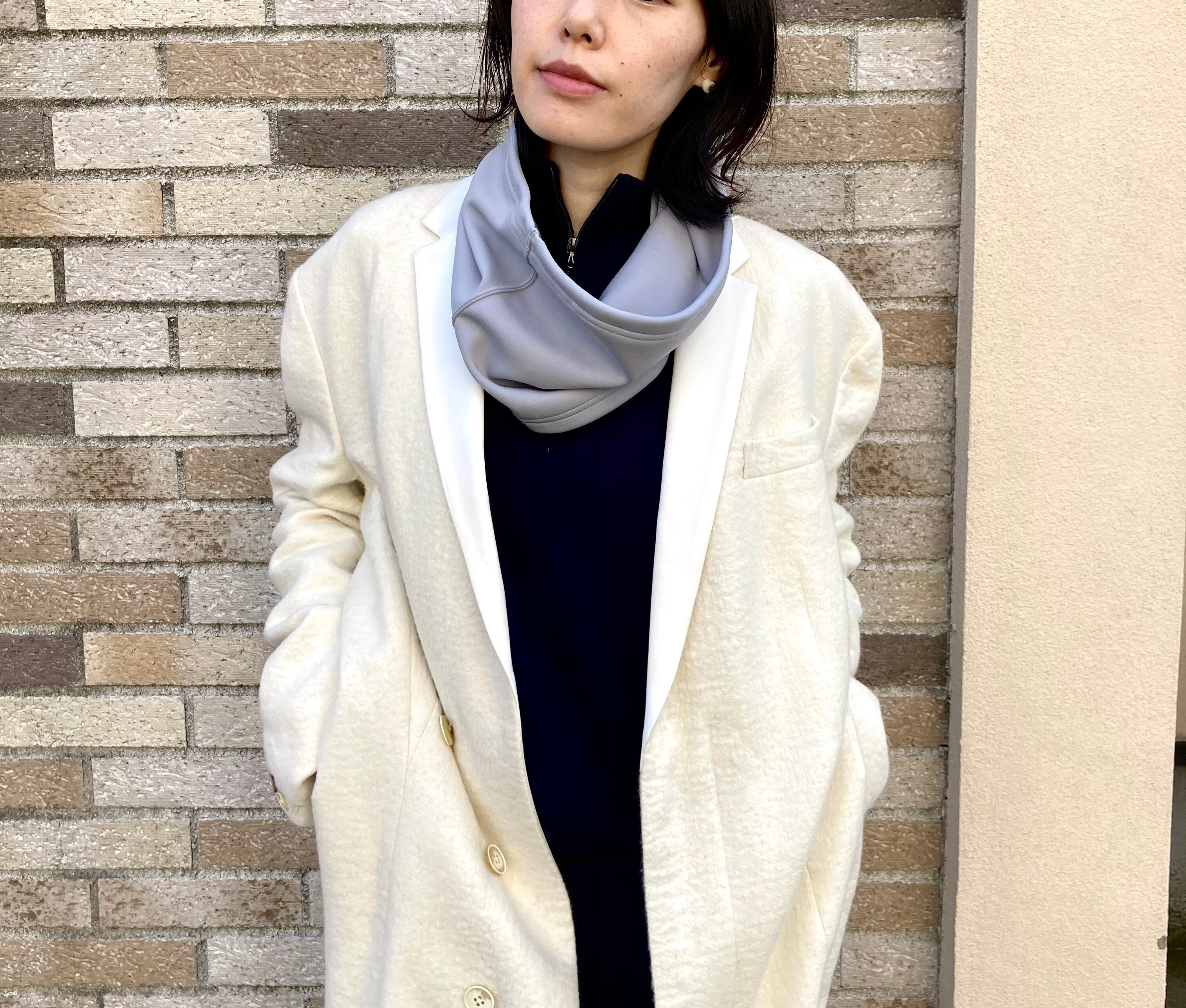 ・首をスポッと通してかぶり、ゴムアジャストで自由な位置に固定して着用できる、スヌードタイプです。